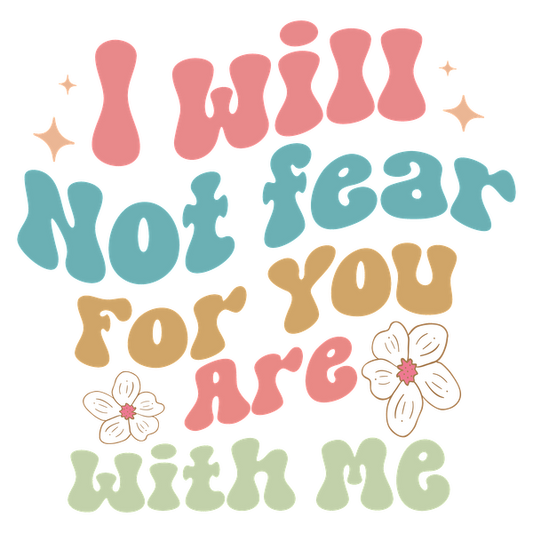 A colorful and artistic illustration featuring the uplifting phrase, "I will not fear for you are with me," surrounded by whimsical flowers and stars. dtf prints