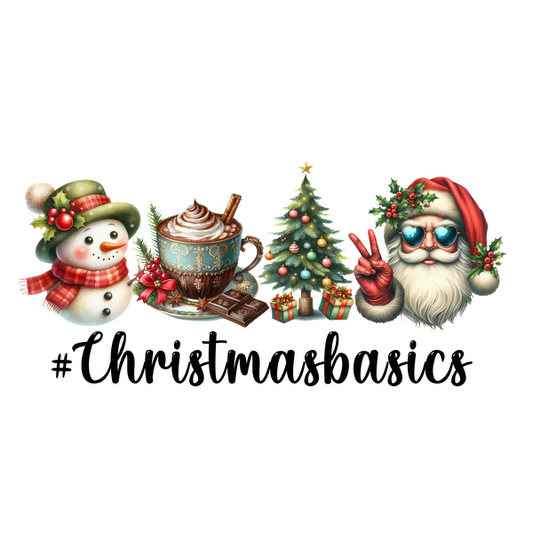 A festive collection featuring a cheerful snowman, hot chocolate, a decorated Christmas tree, and a jolly Santa Claus.dtf regular iron