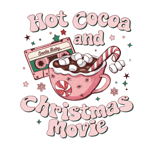 Cozy illustration featuring hot cocoa topped with marshmallows and a candy cane, accompanied by a festive cassette tape. heat press transfers