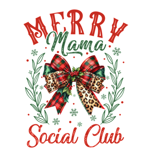 Festive "Merry Mama Social Club" design featuring a vibrant bow with leopard print, surrounded by greenery and holiday elements. heat press transfers