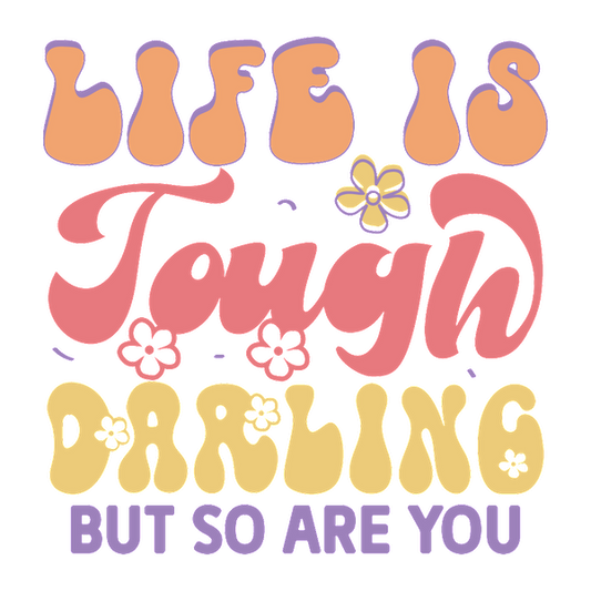 A vibrant and motivational graphic design featuring the phrase "Life is tough, darling, but so are you," adorned with colorful flowers. dtf transfers