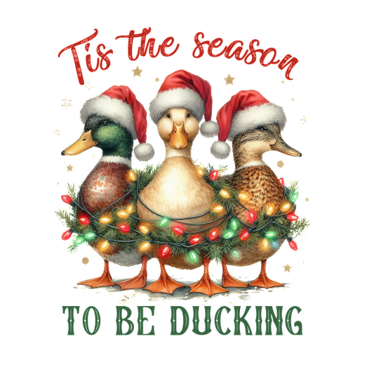 Festive ducks in Santa hats are adorned with Christmas lights and greenery, perfect for the holiday season!dtf regular iron