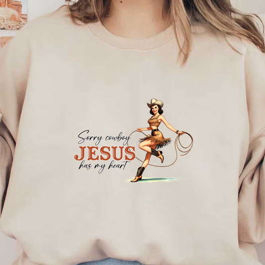 A cheerful cowgirl in a fringed outfit holds a lasso, playfully stating, "Sorry cowboy, Jesus has my heart." heat press transfers