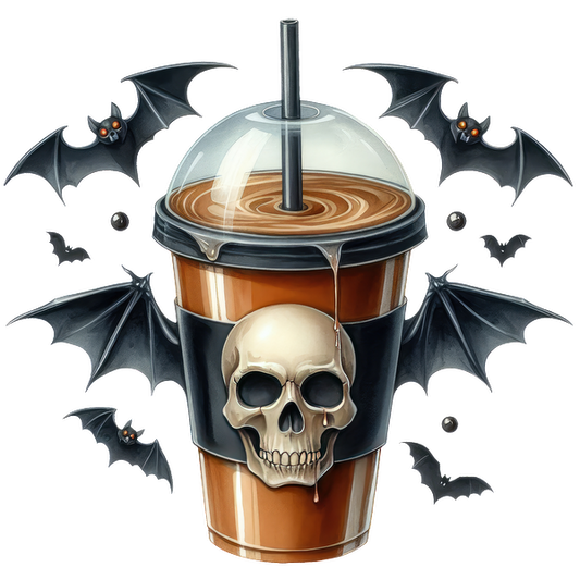 A spooky Halloween-themed drink featuring a skull design and dripping details, surrounded by playful bats.dtf regular iron