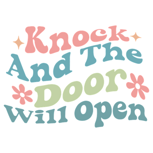 Bright and playful text artwork that says, "Knock And The Door will open," featuring colorful letters and charming floral accents. dtf prints