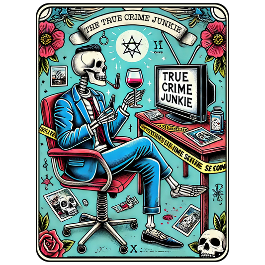 A stylish skeleton, suited in blue, enjoys wine while surrounded by true crime memorabilia in a vibrant, artful setting.dtf regular iron