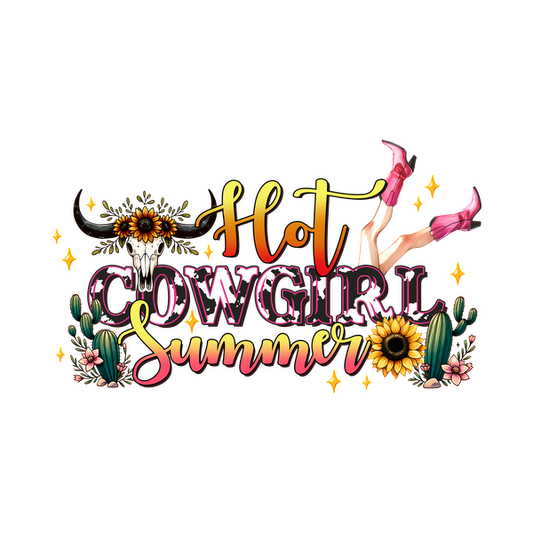 A vibrant and playful design featuring "Hot Cowgirl Summer," with floral accents, cacti, and a whimsical cowboy aesthetic.dtf regular iron