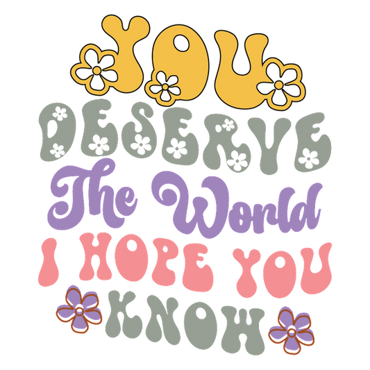 A colorful and cheerful text design that expresses a heartfelt message: "You deserve the world, I hope you know."dtf regular iron