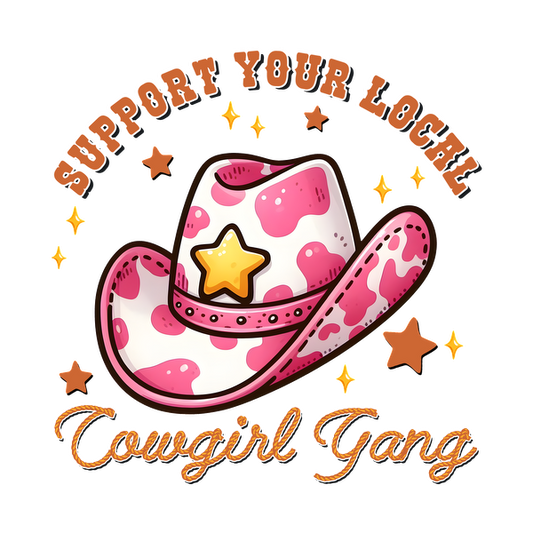 This charming graphic features a pink spotted cowboy hat with a star, surrounded by playful text supporting a local cowgirl gang.
