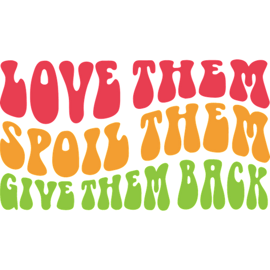 A colorful, playful graphic featuring the uplifting phrase, "Love them, spoil them, give them back," in bold, retro lettering.dtf regular iron