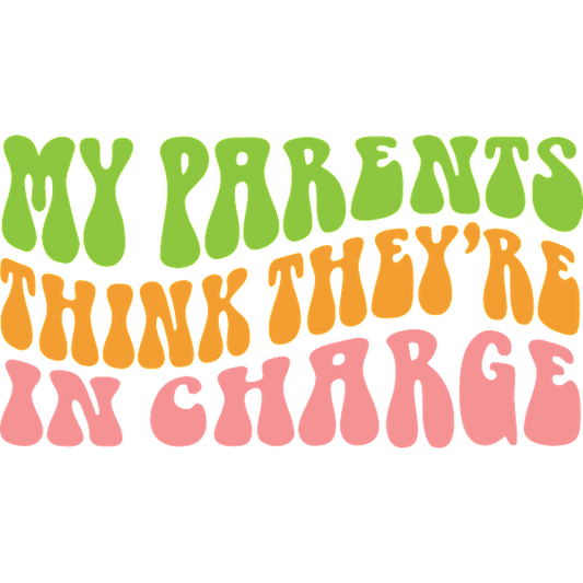 Playful text graphic declaring "My parents think they're in charge" in vibrant, colorful retro font. Perfect for expressing youthful rebellion! dtf transfers