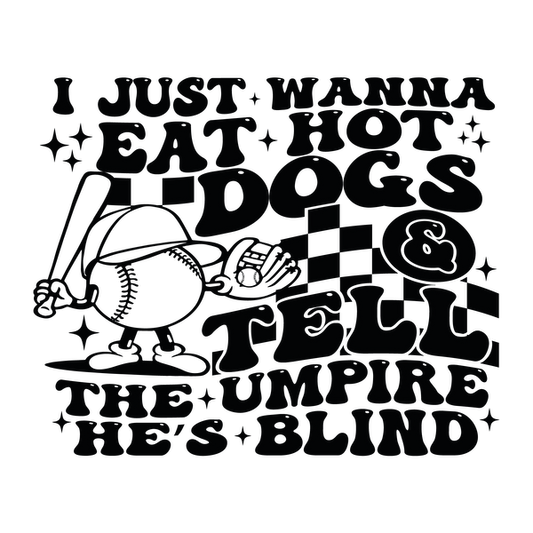 Catchy graphic featuring a whimsical character with a bat, highlighting a humorous phrase about enjoying hot dogs and baseball. dtf transfers
