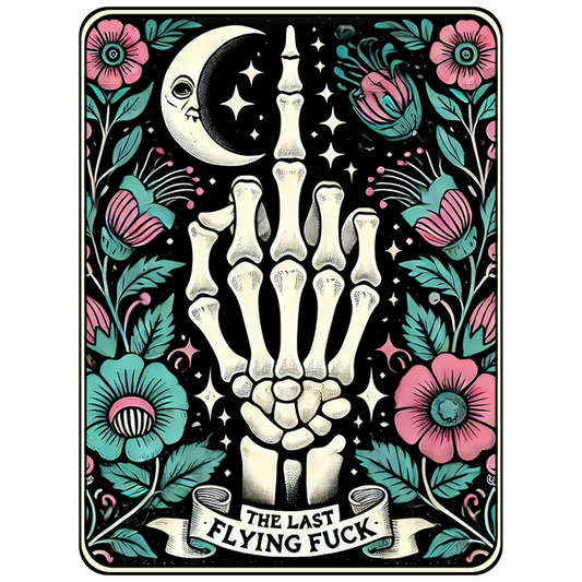 Prix habituel À partir de £0.74 GBPPrix habituelPrix unitaire / par£2.38 GBPPrix promotionnel À partir de £0.74 GBPA vibrant, psychedelic illustration featuring a skeletal hand amidst colorful flowers and stars, captioned "The Last Flying Fuck." heat press transfers