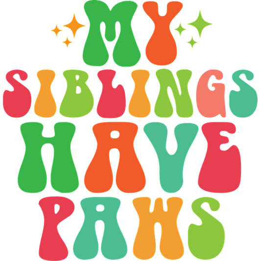 A colorful and playful text design saying, "My siblings have paws," celebrating pet siblings with fun, wavy letters. dtf transfers
