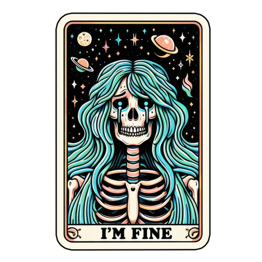 A vibrant, whimsical illustration of a skeleton with long, teal hair against a galaxy backdrop, featuring the text "I'M FINE." dtf transfers