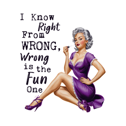 A retro pin-up girl in a purple dress, playfully holding a cigarette with a cheeky slogan about right and wrong. heat press transfers