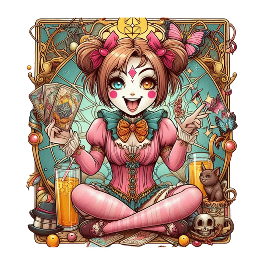 A whimsical, cartoon-style illustration of a cheerful girl in pink attire, surrounded by tarot cards, butterflies, and playful elements. dtf prints