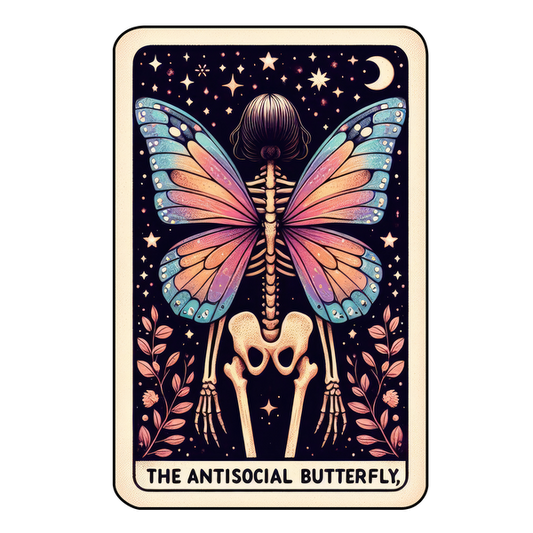 A vibrant art piece featuring a skeleton with butterfly wings, adorned with colorful patterns and surrounded by a starry night sky.dtf regular iron