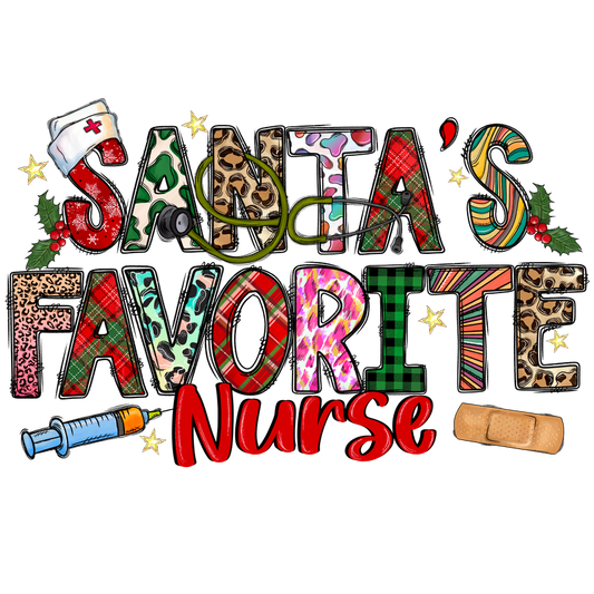Celebrate the holiday season with this colorful "Santa's Favorite Nurse" graphic, featuring playful patterns and festive medical elements!DTF Transfersdtf regular irondtf regular iron