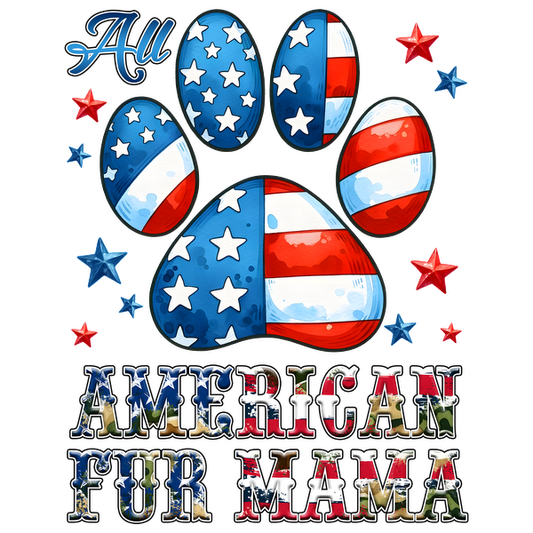 Celebrate patriotism with this vibrant graphic featuring a colorful paw print and the phrase "All American Fur Mama."dtf regular iron