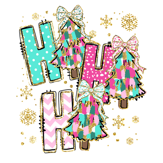 A festive design featuring colorful Christmas trees adorned with bows amidst playful "H" letters and sparkly accents, perfect for holiday cheer!DTF Transfers