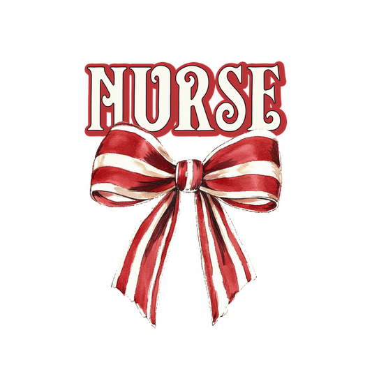 A festive design featuring the word "NURSE" above a large, red and white striped bow, perfect for celebrating healthcare professionals. heat press transfers