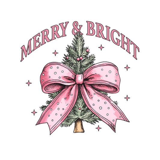 A cheerful illustration of a Christmas tree with a pink bow, accompanied by the text "Merry & Bright." heat press transfers