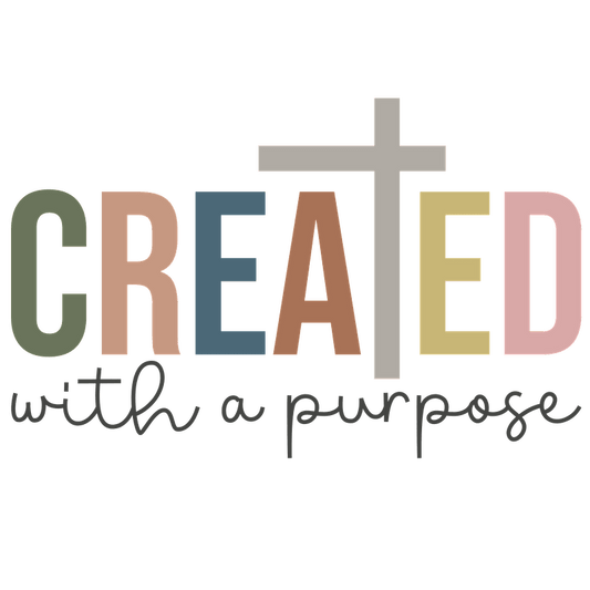 A vibrant and inspiring design featuring the words "Created with a purpose" alongside a simple cross, ideal for motivational decor.DTF Transfers