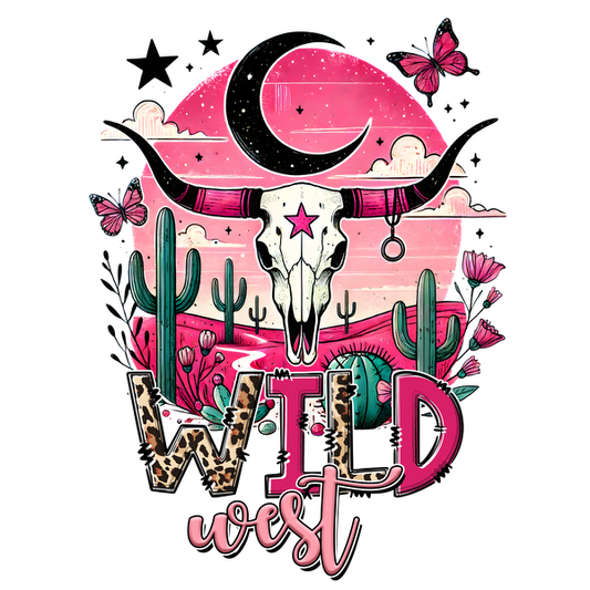 A vibrant graphic featuring a bull skull against a pink sunset, adorned with cacti and the text "Wild West." dtf transfers
