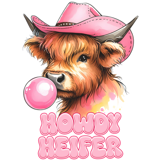 A playful illustration of a cow wearing a pink cowboy hat and blowing bubblegum, captioned "Howdy Heifer." dtf prints