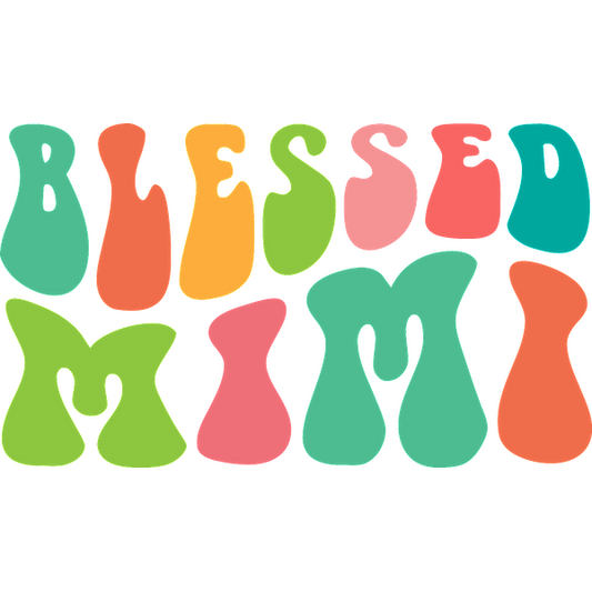 Colorful and playful text artwork featuring the phrase "Blessed Mimi" in vibrant, wavy letters, perfect for a cheerful display.dtf regular iron