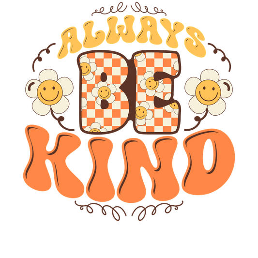 A cheerful design featuring the phrase "Always Be Kind," embellished with smiling flowers and a playful, colorful font. heat press transfers
