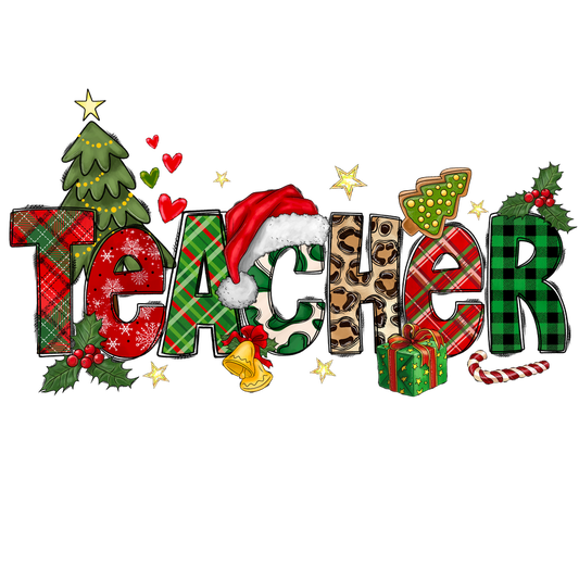 Festive "TEACHER" graphic featuring colorful letters adorned with Christmas motifs like a tree, gifts, and a Santa hat.DTF Transfers dtf prints