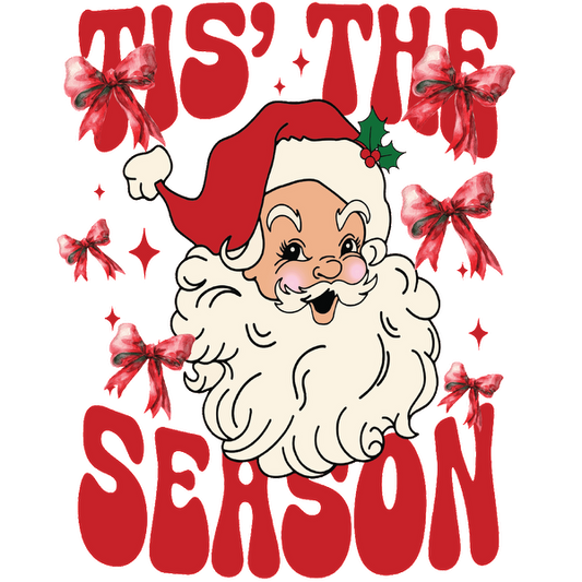 Cheerful Santa with a jolly smile and festive bows, celebrating the holiday spirit with the phrase "Tis the season!"dtf regular iron