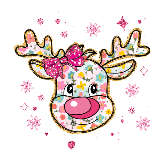 A whimsical reindeer illustration featuring colorful floral patterns and a cute pink bow, surrounded by sparkling snowflakes.DTF Transfers heat press transfers