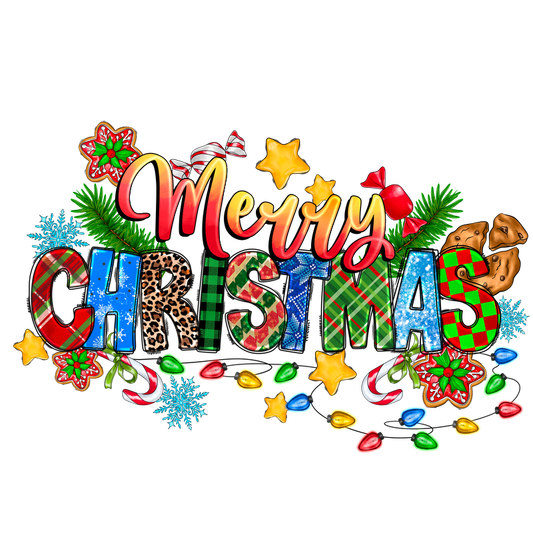 Colorful and festive "Merry Christmas" design featuring playful patterns, holiday treats, and cheerful decorations to evoke holiday spirit.DTF Transfers dtf prints