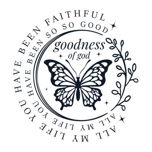 A beautifully designed circular graphic featuring a butterfly and floral elements, emphasizing the theme of God's goodness and faithfulness.DTF Transfers