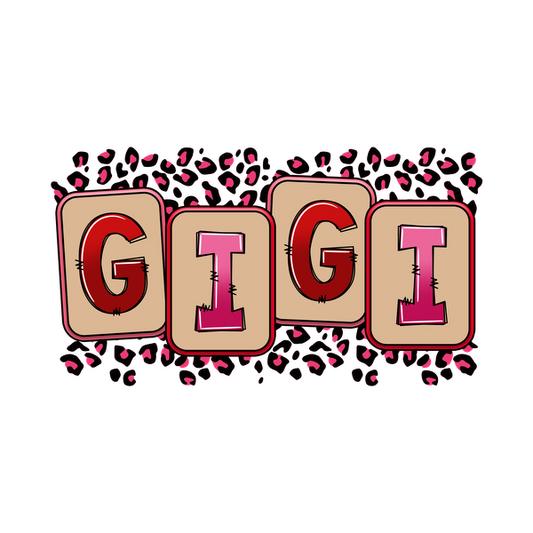 Colorful, playful text spelling "GIGI" with a whimsical design and a vibrant, patterned background, perfect for a fun project. heat press transfers