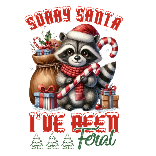 A cute raccoon wearing a Santa hat holds candy canes near festive gifts, with the playful text: "Sorry Santa, I've been Feral." dtf transfers