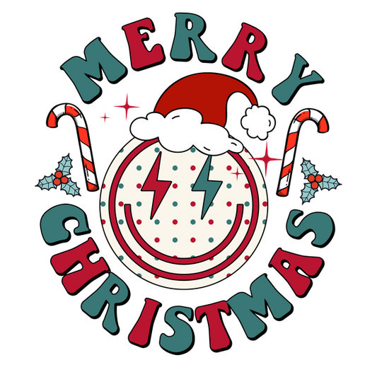 Cheerful "Merry Christmas" graphic featuring a smiling face with a Santa hat, candy canes, and festive colors.dtf regular iron