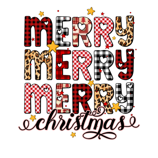 Festive "Merry Christmas" design featuring vibrant, patterned letters and playful stars, perfect for holiday cheer and celebrations.dtf regular iron