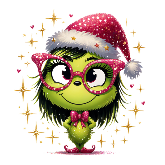 A cheerful green character in a sparkly Santa hat and oversized glasses, complete with a festive bow tie.DTF Transfers dtf prints