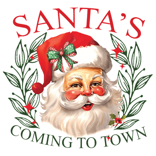 Cheerful vintage design featuring Santa with a festive bow, surrounded by holly, with the text "Santa's Coming to Town." dtf transfers