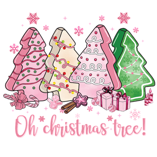 Cheerful illustration of colorful Christmas trees with decorations, accompanied by gifts and the festive phrase "Oh Christmas tree!" dtf transfers