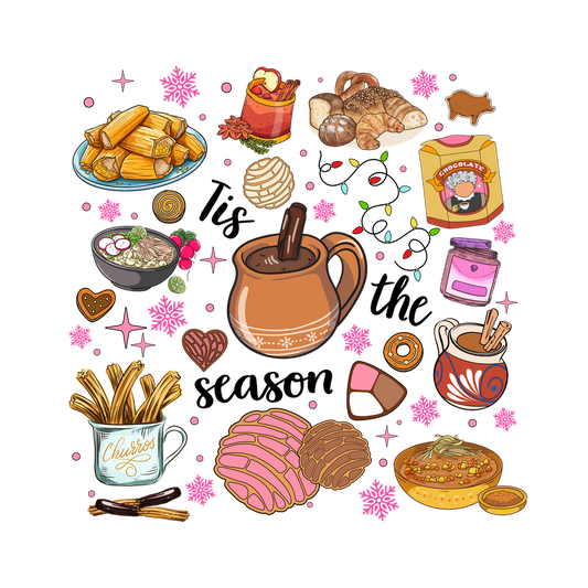 A colorful assortment of delicious treats, including tamales, churros, chocolates, and cozy beverages, celebrating a festive culinary delight.DTF Transfers dtf prints