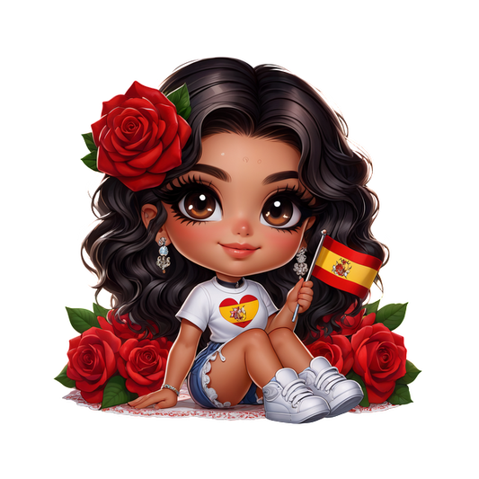 A cute character with curly hair, holding a Spanish flag, surrounded by red roses, wearing a white shirt and shorts.DTF Transfersdtf regular iron