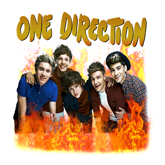 This vibrant artwork features the iconic boy band One Direction surrounded by fiery graphics, celebrating their energetic style and popularity.DTF Transfers