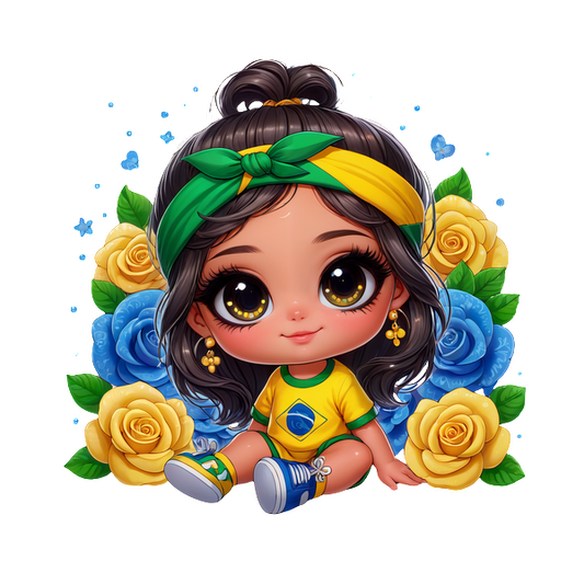 A cute, chibi-style girl with large eyes, dressed in a Brazil-themed outfit, surrounded by colorful flowers and vibrant greenery.DTF Transfers dtf prints