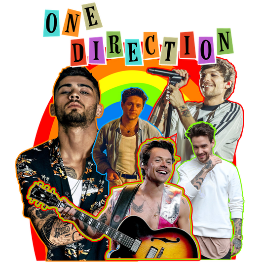 Prix habituel À partir de £0.74 GBPPrix habituelPrix unitaire / par£2.37 GBPPrix promotionnel À partir de £0.74 GBPA vibrant collage featuring the members of One Direction against a colorful rainbow background, showcasing their diverse styles and musical talents.DTF Transfers heat press transfers