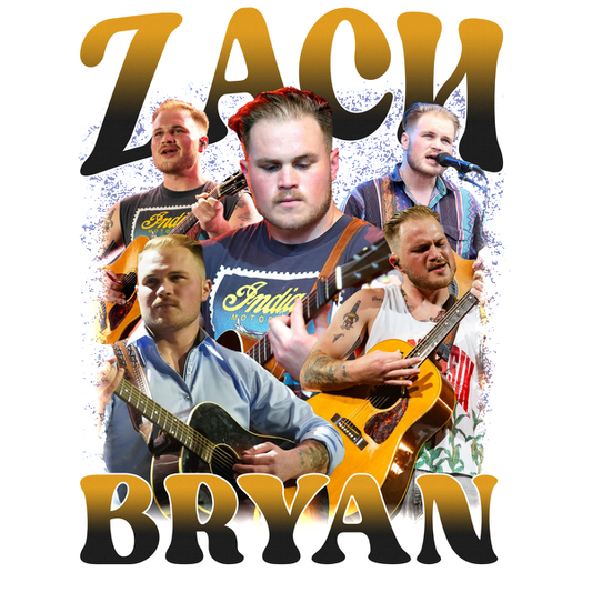 A vibrant collage of Zach Bryan performing with his guitar, showcasing his expressive talent and laid-back style.DTF Transfers heat press transfers